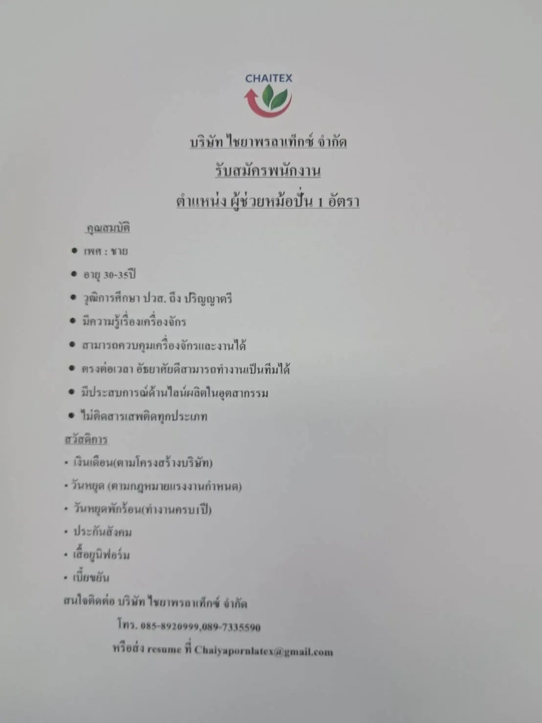 ผู้ช่วยหัวหน้าฝ่ายผลิต (แผนกหม้อปั่น)