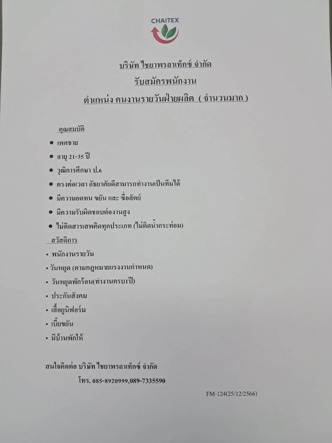 คนงานรายวันฝ่ายผลิต (เพศชาย)