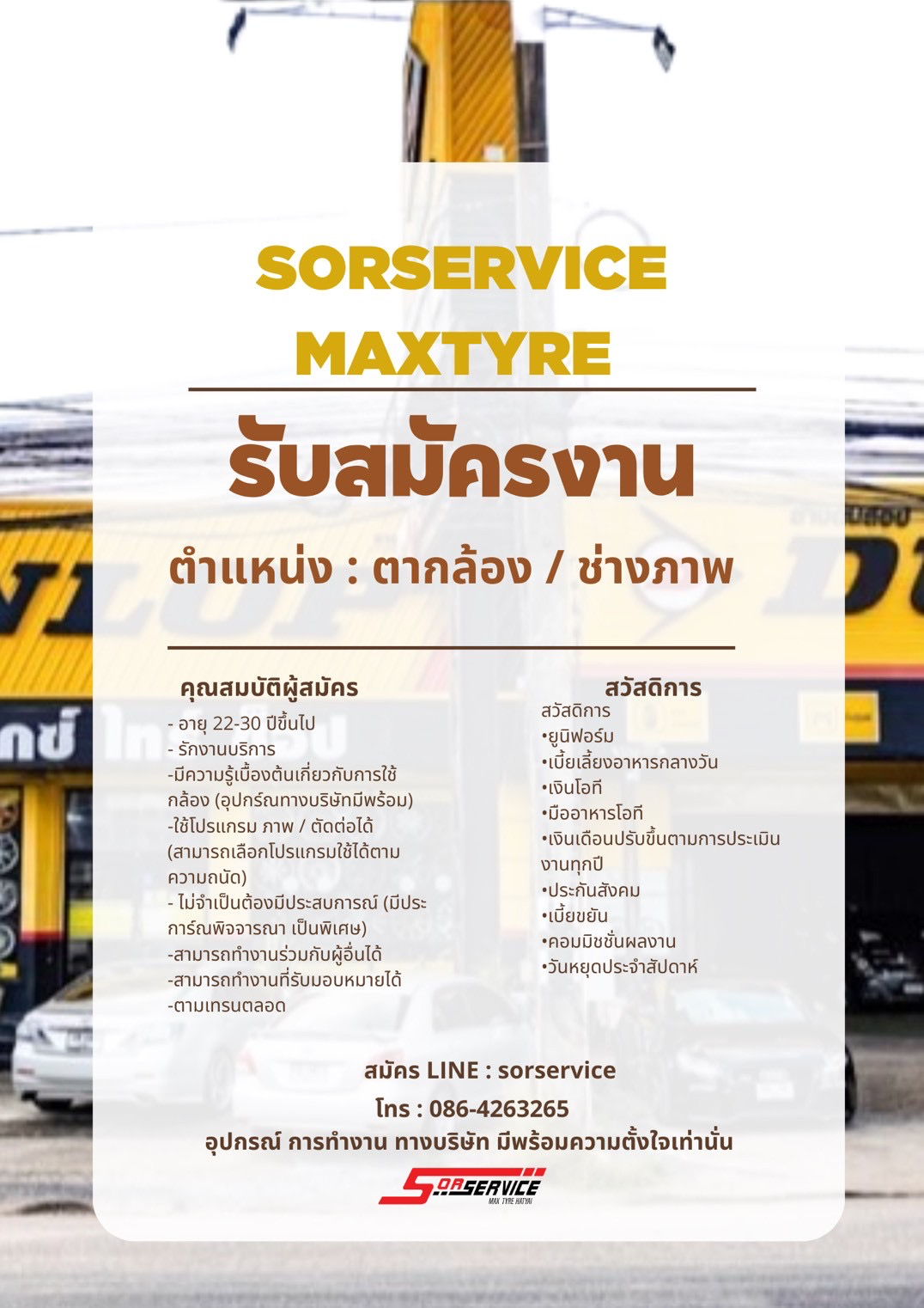 - สามารถทำงาน นอกสถานที่ ในพื้นที่ และ ต่างจังหวัดได้ ปีล่ะ 1-2 ครั้ง - เงินเดือน สวัสดิการดี -ใจรักงานบริการ ทำงานเป็นทีมได้ สนใจส่ง เรซูเม่ : line sorservice / 086-4263265