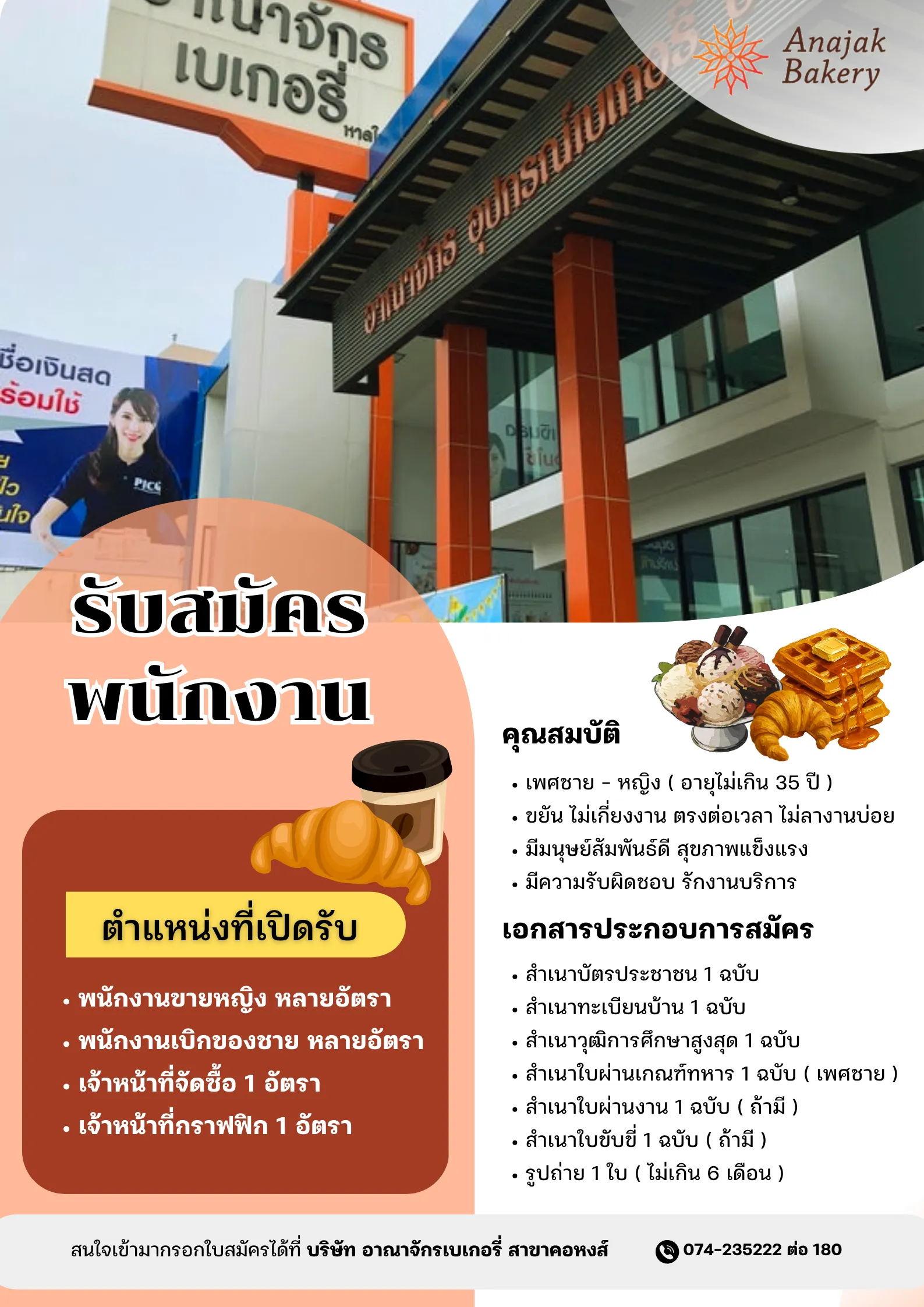 สนใจเข้ามากรอกใบสมัครได้ที่ อาณาจักรเบเกอรี่ ( สาขาคอหงส์ ) ทุกวันจันทร์ - เสาร์ ตั้งแต่เวลา 08.00 - 16.00 น.