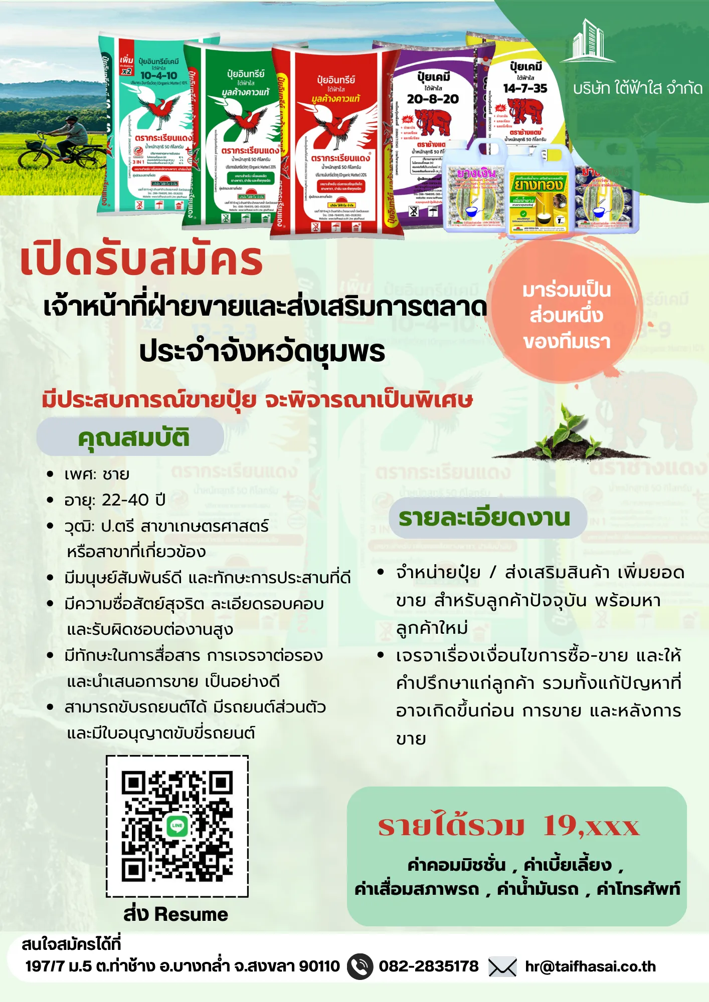 เจ้าหน้าที่ฝ่ายขายและส่งเสริมการตลาดปุ๋ย จ.ชุมพร - บริษัท ใต้ฟ้าใส จำกัด | Gimyong Jobs | Gimyong Jobs