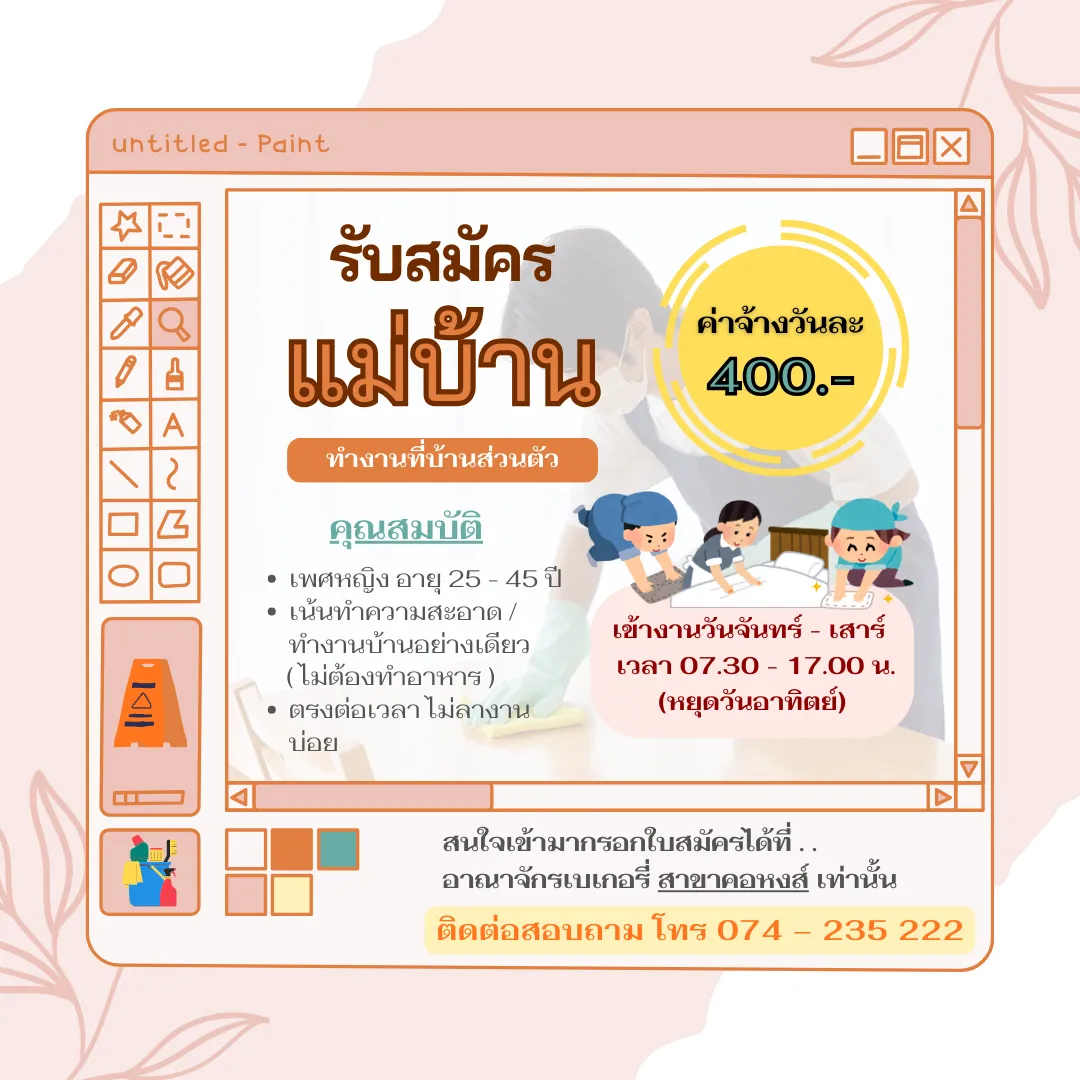 - เน้นทำความสะอาด / ทำงานบ้านอย่างเดียว ( ไม่ต้องทำอาหาร )