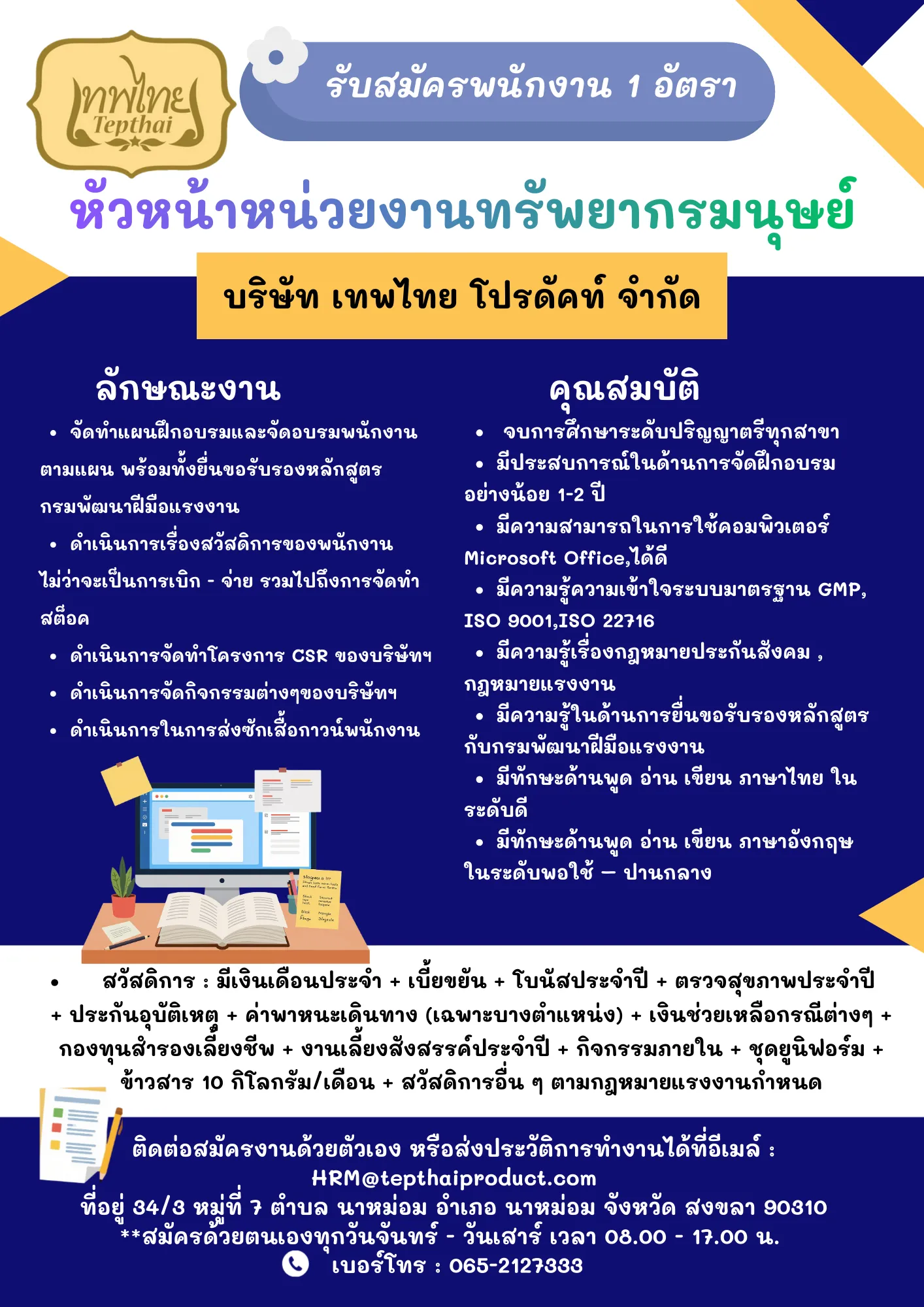34/3 หมู่ที่ 7 ตำบล นาหม่อม อำเภอ นาหม่อม จังหวัด สงขลา 90310 **สมัครด้วยตนเองทุกวันจันทร์ - วันเสาร์ เวลา 08.00 - 17.00 น. อีเมล์ : HRM@tepthaiproduct.com เบอร์โทร : 065-2127333