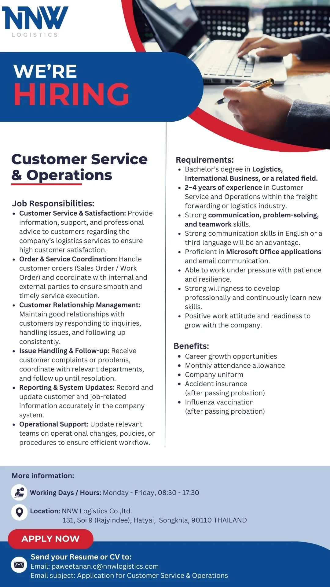 - มีประสบการณ์ทำงานด้านโลจิสติกส์ หรือสายงานที่เกี่ยวข้อง (2-4 ปี)